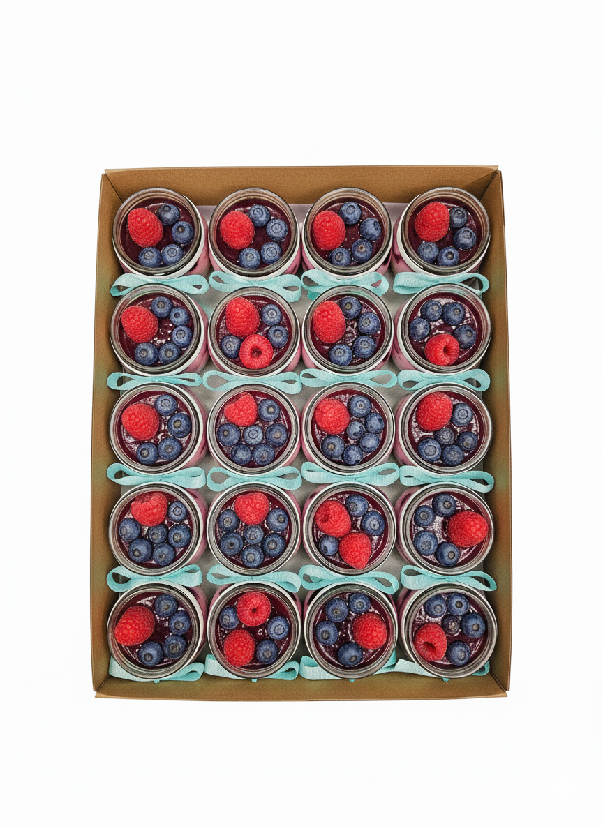 Jogurty w słoiczkach z domową, pieczoną przez nas granolą, musem owocowym oraz świeżymi owocami.